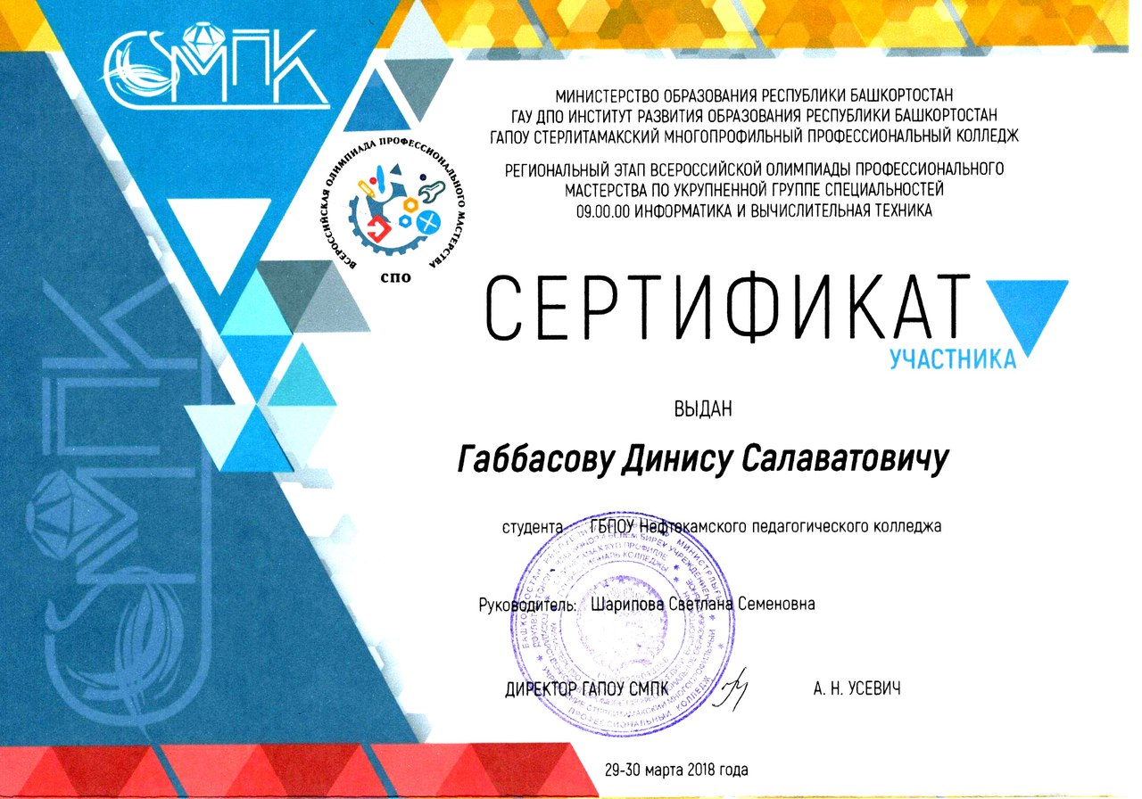 29-30 марта 2018 года в городе Стерлитамаке на базе ГАПОУ Государственное автономное профессиональное образовательное учреждение Стерлитамакский многопрофильный профессиональный колледж прошел Региональный этап Всероссийской олимпиады профессионального мастерства по УГС 09.00.00 Информатика и вычислительная техника.